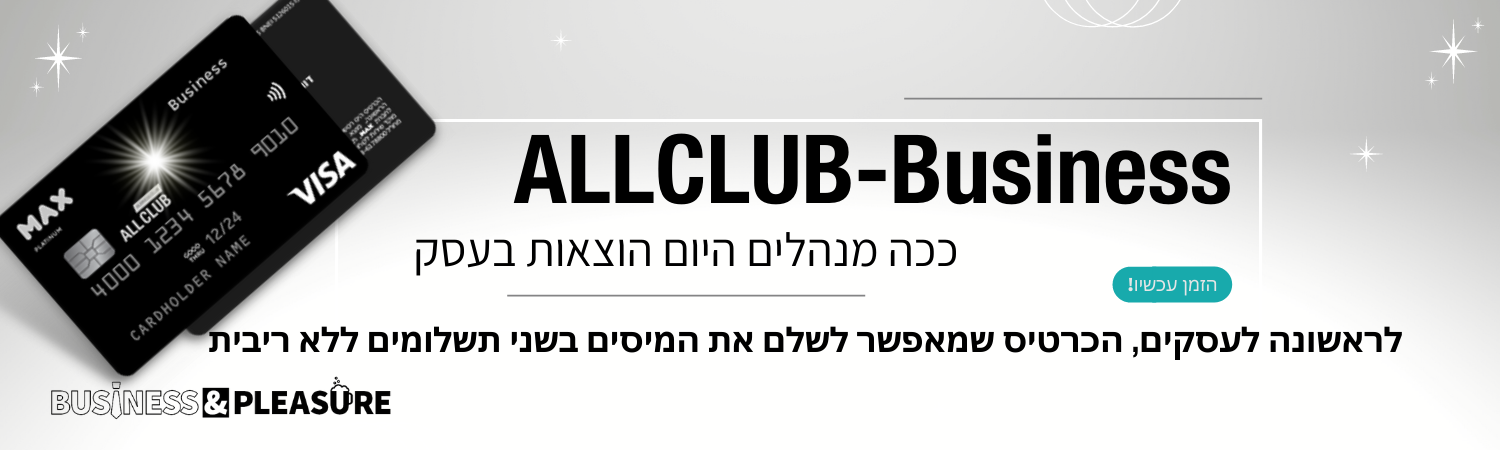ההטבות. *מתנת הצטרפות: קבלת כרטיס ה-giftcard ומימושו מותנים בהפעלת הכרטיס ובביצוע עסקה ראשונה בכרטיס האשראי. כרטיס תשלום כהגדרתו בחוק הבנקאות (רישוי), התשמ”א-1981. לעניין זה “עסקה” לא כולל משיכות מזומנים, עמלות, ריביות, הלוואות ומוצרי אשראי שונים. אין החזר כספי בגין אובדן/גניבה/אי-שימוש. השימוש בכרטיס בהתאם לעלון הנלווה. תוקף הכרטיס הנטען 5 שנים. בתי העסק בהם ניתן לממש את ה-GC עשויים להשתנות מעת לעת. המוצרים והשירותים באחריות בית העסק בלבד. הטבה חד פעמית ללקוח ולמצטרפים חדשים בלבד. *פטור מעמלת דמי כרטיס: ההטבה היא למשך שנתיים, החל ממועד ההצטרפות וכל עוד הכרטיס משויך למועדון. לאחר שנתיים דמי כרטיס יעמדו על 19.90 ₪. הטבה חד פעמית למצטרפים חדשים. max תהיה רשאית לשנות את דמי הכרטיס בכל עת בכפוף לכל דין. *פינוקים 1+1 VIP: צפייה והזמנת הטבות VIP תתאפשר לאחר הזדהות באתר max. הרכישה באמצעות כרטיס אשראי max בלבד. הזכאות לפינוק מותנית בביצוע עסקאות בכרטיס ב-2,000 ש”ח (לא כולל משיכות מזומנים, עמלות, הלוואות ומוצרי אשראי שונים). עד 4 פינוקים בחודש ללקוח (ברמת ת.ז). *פריסת תשלומי מס הכנסה ומע”מ: ההטבה מתעדכנת אוטומטית כך שכל תשלום ארנונה, מים, חשמל וטלפון ייפרס אוטומטית ל-2 תשלומים ללא ריבית. ניתן להסיר את ההטבה בכל עת, בפנייה למוקד הלקוחות של max בטל’ 2133*. *ביטוח נסיעות לחו”ל חינם: בכפוף לתנאי הפוליסה AIG Traveler המלאים של איי אי ג’י ישראל חברה לביטוח בע”מ הניתנים לעיון באתר AIG ובאתר max. הפוליסה אינה מעניקה כיסוי למצב מחלתי קיים, להחמרתו או להיריון. הביטוח בחינם ניתן עד חמישי ימי שהייה רצופים בחו”ל בלבד. ברכישת ביטוח נסיעות לכל תקופת הנסיעה. לאחר תקופת ההטבה, התשלום בהתאם לפוליסה שנרכשה. *Pay-Back: בכפוף לתקנון Pay-Back. *מסגרת אשראי: בכפוף לתנאי החברה. *קביעת גובה ההחזר החודשי: בכפוף לתנאי ההצטרפות. יתרת הסכום, שלא תחויב, תצורף לסל עסקות מצטבר נושא ריבית בהתאם לריבית שנקבעה בכרטיס. אי עמידה בפירעון ההלוואה עלול לגרור חיוב בריבית פיגורים והליכי הוצאה לפועל. *כל מה שכתוב למעלה הוא בכפוף להסכם ההצטרפות ולתנאי הכרטיס וההטבות. הטבות יחודיות ינתנו על ידי חברת ALLCLUB ובאחריותה. *אי עמידה בפירעון ההלוואה עלול לגרור חיוב בריבית פיגורים והליכי הוצאה לפועל. כפוף לאישורה של מקס איט פיננסים בע”מ. *לצפייה בתעריפון העמלות.